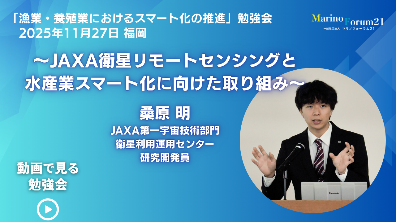 2025年11月27日に福岡で行われた「漁業・養殖業におけるスマート化の推進」勉強会のJAXA衛星リモートセンシングと水産業スマート化に向けた取組み(JAXA 桑原様 【R7.11.27福岡勉強会】発表です。